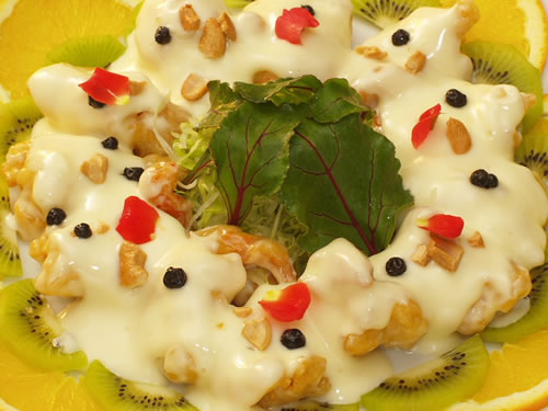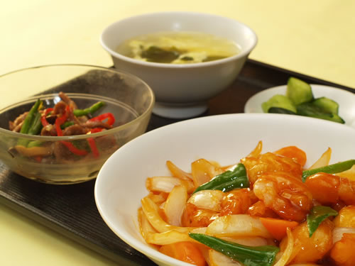 * 千焼明蝦/大海老のチリソース 2,310 円 * 千焼蝦仁/海老のチリソース煮 1,680 円 * 糖醋蝦仁/海老の甘酢炒め 1,680 円 * 青豆蝦仁/蝦とグリンピースの炒め 1,680 円 * 紅焼排翅/一枚フカヒレの醤油煮 6,300 円 * 紅焼鮑魚/鮑の醤油煮 4,200 円 |