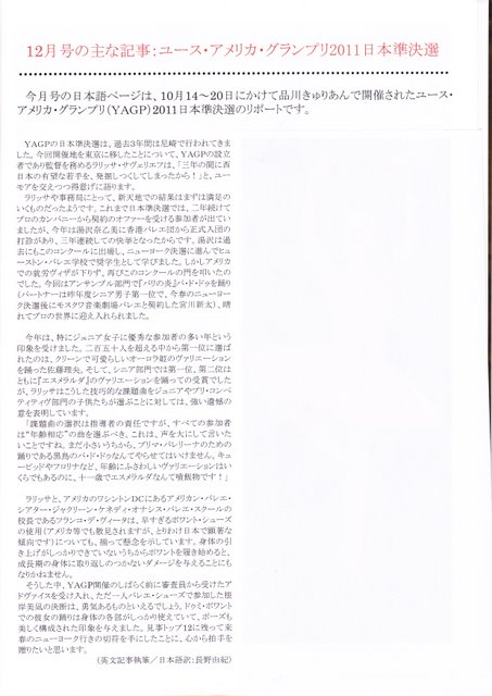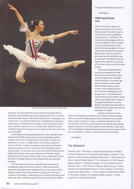 香港バレエ団に入団した湯沢奈乙美が、DANCE EUROPEに 大きく掲載されました。YAGPのシニアで1位になった時の踊りや解説が掲載されています。裏の写真に日本語の解説が載っています。