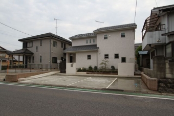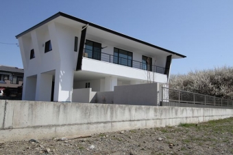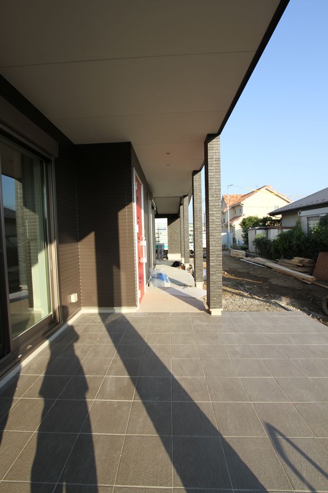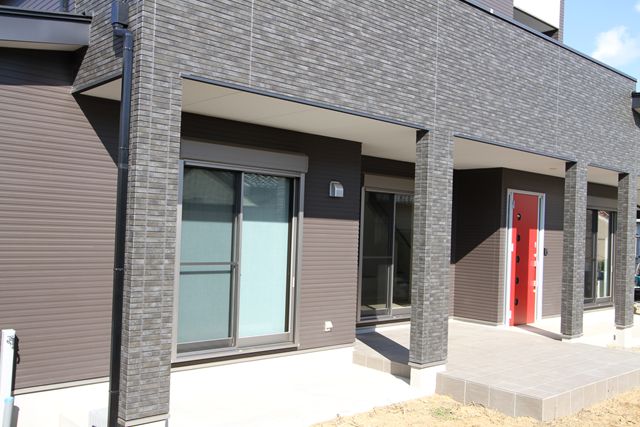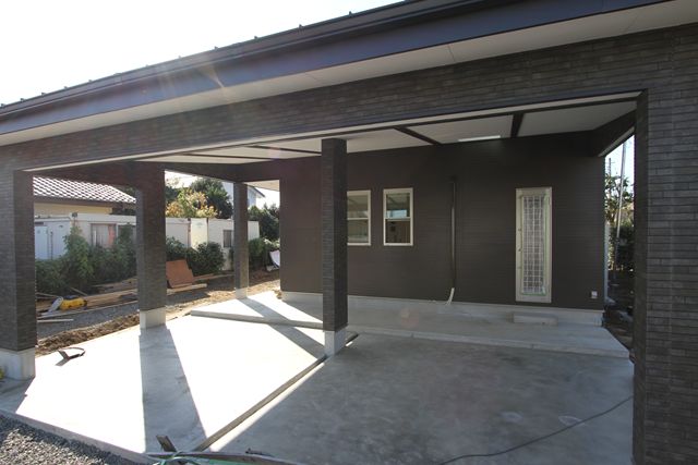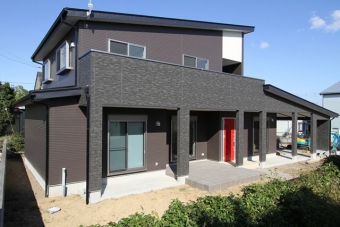 お施主様の外観にカラーテーマ『レッド』をポイントにして、ブラウンとホワイトでスタイリッシュに仕上げました。 車好きのお施主様のご意向を取り入れ8mの大梁を用いて大開口を実現した広いガレージ。天井は登梁を魅せアクセントにしています。 南側に3.6m四方の大きな半インナーテラスを設け、和室、玄関とテラスがピロティーでつながりガレージまで続いております。