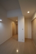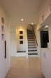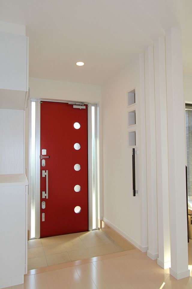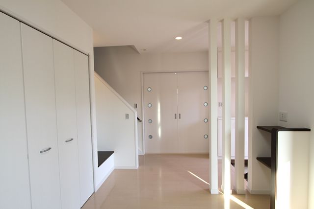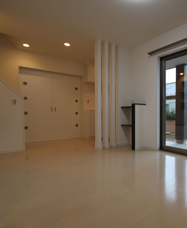 玄関ホールを広くとり、LDKと和室の扉を開け放つことで13mの奥行きと約32帖の空間が一つにつながり、大きな半インナーテラスと一体の空間になるような設計になっております。 階段横と玄関には小窓風のニッチを縦に並べ、小物や家族の写真などが飾れるようにしました。 玄関横の壁に縦スリットを設け目隠しをしつつ一体感を持たせる設計になってます。