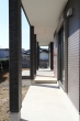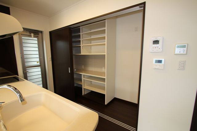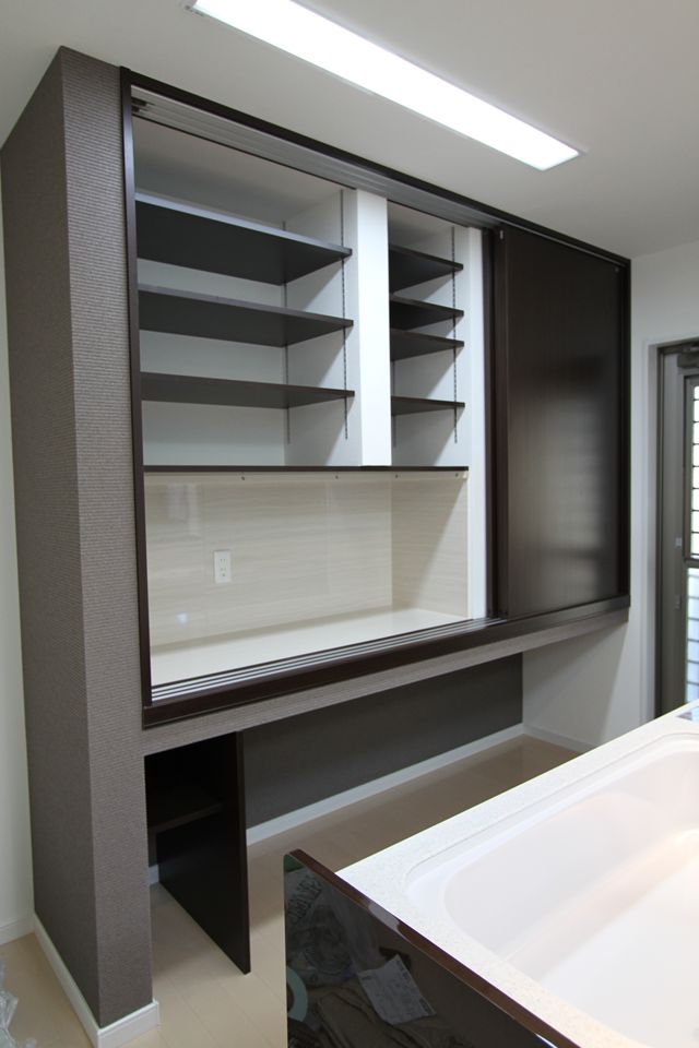 駐車場より緩やかなスロープ階段を施工致し、玄関アプローチには木目調のスクリーンで目隠しを施してあります。 南側には、広めのテラスを施工し、ご家族がテラスで楽しめるようになってます。 奥様のお気に入りのシステムキッチンの後ろには、こだわりのパントリーを設けました。 日々の家事を考え、動線にもこだわりました。 シンプルで落ち着いたお家に仕上げてあります。