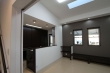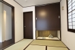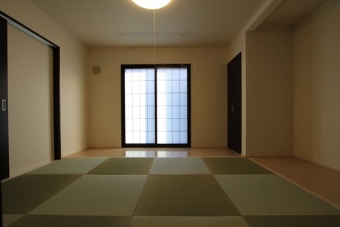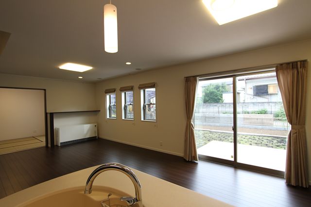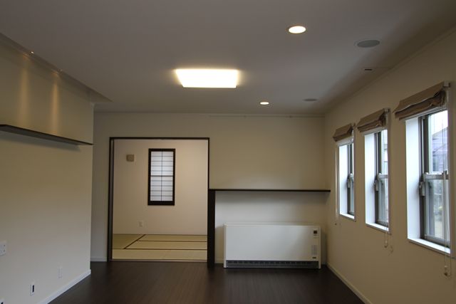 LDKはガレージから続く緩やかな勾配天井で開放感のある空間に仕上げ、天窓を設けました。昼はさわやかな光が降り注ぎ、夜はしっとり月明かりが降り注ぐ。家族5人がゆっくりくつろげる空間に仕上がっています。キッチンの背面にはパントリーをオリジナルオーダーで造作致しました。下部にはワゴンや分別ごみ箱などが置けるよう設計してあります。 和室は畳を市松にし、落ち着いたモダンなイメージ。 2階にはホールに書棚を設け、パブリックスペースとして使う予定。大きなクローゼットも設置しました。3.7mの勾配天井にすることで高窓を設置し明るい空間が実現してます。