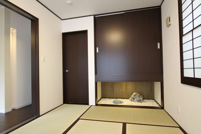 家族が集まるリビングには、音楽好きのお施主様こだわりのスピーカーを天井に埋め込みました。また、ゆっくり音楽を聴きながらお風呂に入れるように、お風呂にもスピーカーが装備されています。 リビングに隣接する和室には天然石と竹で飾り間を設け、間接照明で落ち着いた空間を造りました。