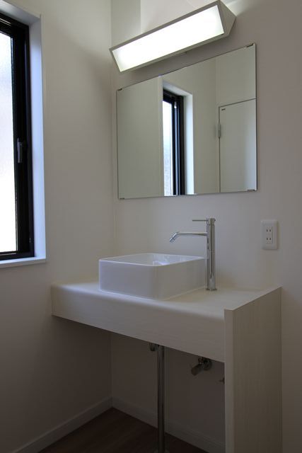 居住空間をすべて2階に設け、1階にはセカンドリビングと収納、トイレを設けました。セカンドリビング南には広いインナーテラスを設け、インナーテラスの前にはこだわりのシンボルツリー、記念樹としてオリーブの樹を植えました。2階のリビングダイニングには大きな窓を設け、ご家族がのんびり過ごせる空間を所々に設けてあります。バルコニーはお施主様こだわりの手すりをオリジナルで造り、飾り木と同色でバルコニーにウッドデッキを設置致しました。 玄関には、お施主様がお気に入りの丸鏡を壁に埋め込みました。2階と1階のトイレには、オリジナルで洗面を設けスタイリッシュに仕上がってます。 |