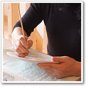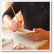 成型を終えて素焼きしたものに絵や文字を入れていきます。 上絵と下絵の2種類あります。
