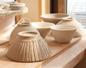 土を叩いて伸ばし、板状にしたものを型にはめて、形をつくります。皿や鉢が簡単に出来ます。