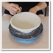 釉薬とは素焼きの後、作品に掛ける薬のことです。これで、色つやが決まります。たくさんの釉薬の中からお気に入りのものを選んで下さい。土の種類と釉薬の種類の組み合わせで焼き上がりの色が変わってきます。教室内にあるテストピース(見本)をみながら、経験豊富な講師と相談しながら決めていきましょう。ただし、焼き物というものはほんの少しの焼成環境の違い等で色合いや風合いが全く異なって現れたりします。見本と同じようには焼きあがらない場合がございますのでご了承ください。