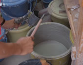 土の固さを均一にする荒練りをした後、中に含まれる空気を抜く菊練りをします。練った跡が菊の花のように見えることから菊練りと呼ばれています。"菊練り3年"と言われるほど難しいものです。スタッフが土を練った状態でご用意しております。
