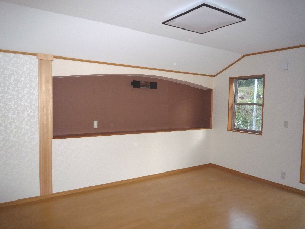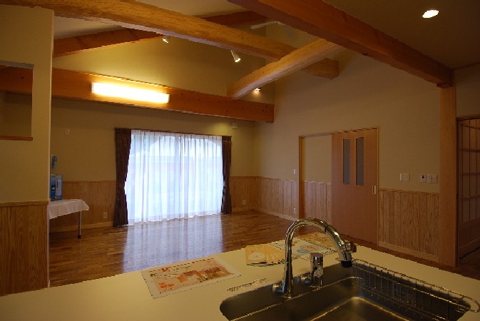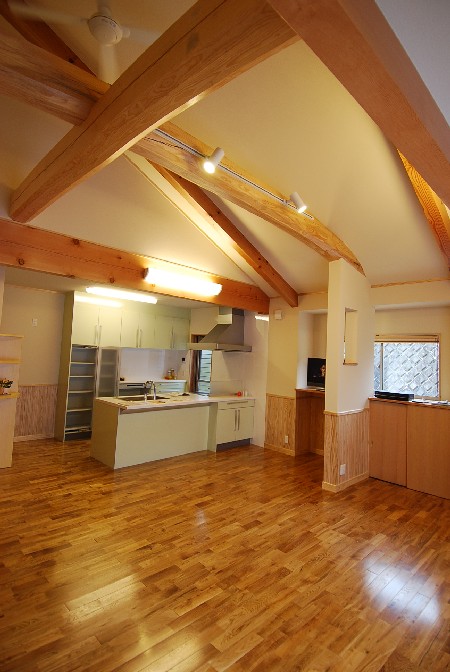 この建物のメインである広々としたLDKです。 床は楢の無垢材、腰壁は杉板、壁と天井はジョリパットの吹き付け仕上げとなっています。 木部の艶出し塗装は、どれ位の艶を出すのかを、何度もお施主様と協議して決めました。