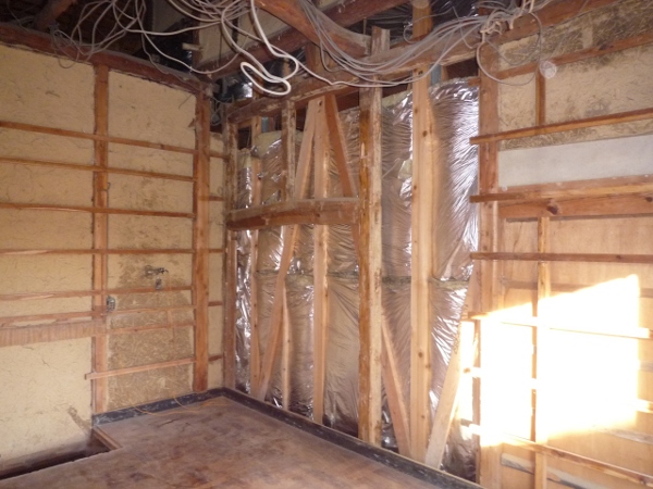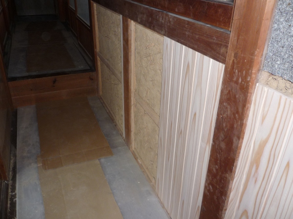 壁の塗り直しを辞めて、板を張りました。上土壁をはがして杉板を縦に張り、着色仕上げとします。 白蟻の被害有り 2011/01/24