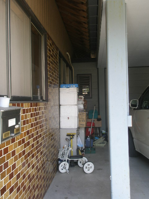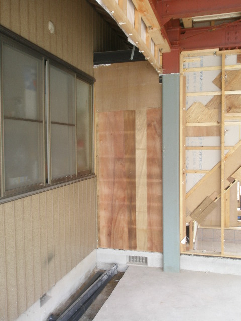 1階は写真でお解かりになるように車庫になっております。 又母屋とも行き来でき、工事が大変そうな予感がします。 なぜ?まず住居スペースとして天井の高さが確保出来るか? その次ぎに母屋の屋根部分が鉄骨造の方にながれている。など問題が山積みです。 調査の結果、一部天井高は低くなりますが確保できそうでした。 屋根部分もなんとか納まりそうです。 リフォームは事前調査が大切です。 |