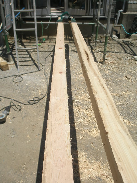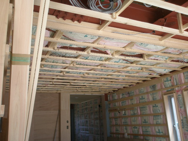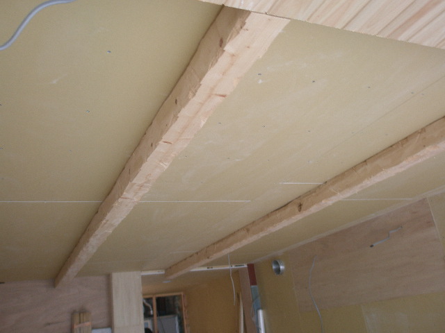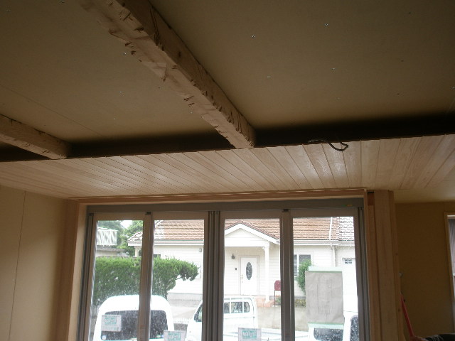付梁を取付ます。 今回,梁はお施主様の希望で古材風という事で正直困りました。 どうしょう?と迷いましたが大工さんに道具を借りて思い切って私が削ることにしました。 綺麗なものを荒くするという事はあまりないので悩みながら造ってみましたが、 なかなか感じがでたなーと自画自賛です。 又構造上どうしても天井に段差が生じるので、その部分には桧の羽目板を貼りました。 写真でおわかりになると思いますが、大きなサッシがあります。 このサッシは折れ戸式になっており全開口になります。窓を開けるとまるで外にいる様で開放感があります。 大工さんも初めて取付たんですが、工事中も『開放感があり、ええなー』と感心していました。 ただ難点なのがお値段が高め・・・メーカーさん何とかしてください 内部工事 2010/05/25