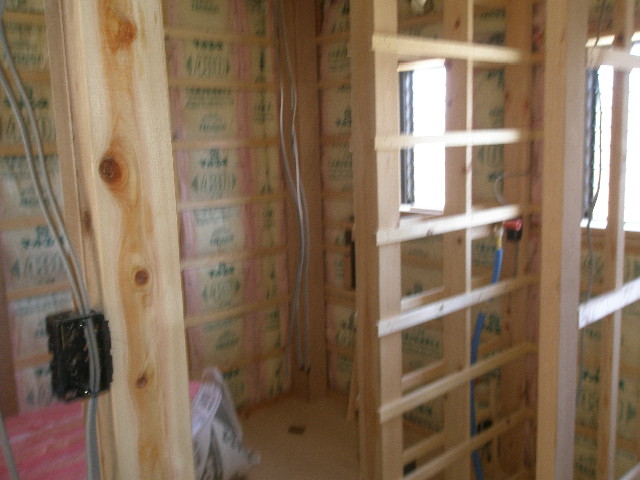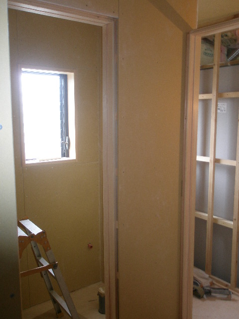 どうしても天井高さが取れず段差になってしまいます。 段差を利用した堀天井風にしてみました。 2枚目の写真はユニットシャワーの扉の部分です。 今回お施主様のご要望とスーペス的な問題でお風呂がありません。 お風呂は母屋の方でお使いになると言う事です。 3枚目の写真は階段下レンジ台のクロスを貼る前です。 デッドスペースを有効に利用しました 内部工事 2010/05/25