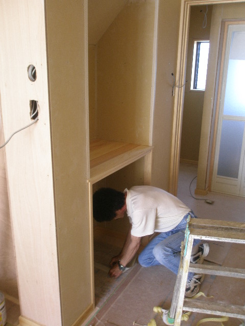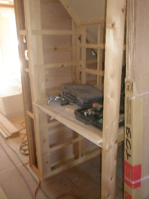 今回建具枠も無垢桧を採用しました。 製材屋さんから材料を仕入れ、加工屋さんで加工してもらいました。 大工さんでも可能なのですが時間や費用が高くなる為加工屋さんに頼みました。 仕上がりは既製品の様になりました。 大工さんの道具が置いてある写真ですが、レンジや炊飯器を置く棚になります。 この棚も無垢材です。実は床材の端材を使用しました。 内部工事 2010/05/25