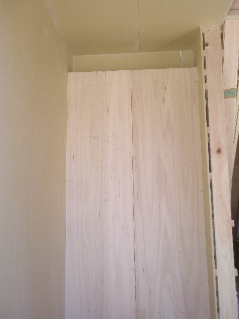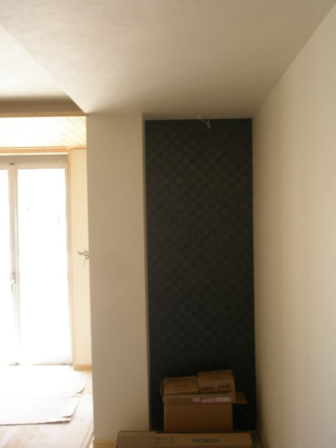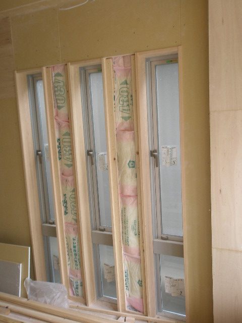 下部はFIXになっています。窓枠は桧無垢になっています。 2枚目は玄関ホール正面の壁なんですが、コンパネ部分の後ろに間接照明を取付ます。 又この部分のクロスを少し変わったものを貼る予定です。 玄関からインパクトをあたえるお家になる予定です。 完成をお楽しみに 内部工事 2010/05/25