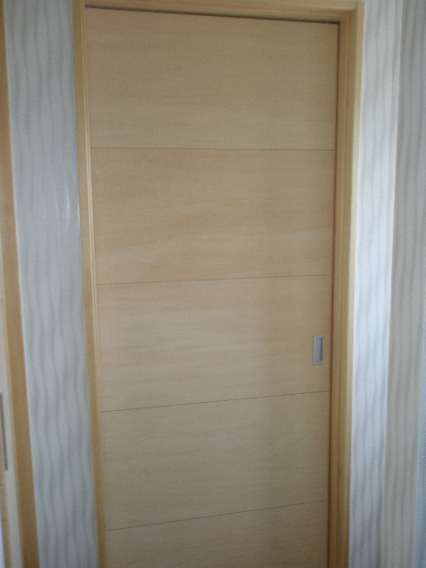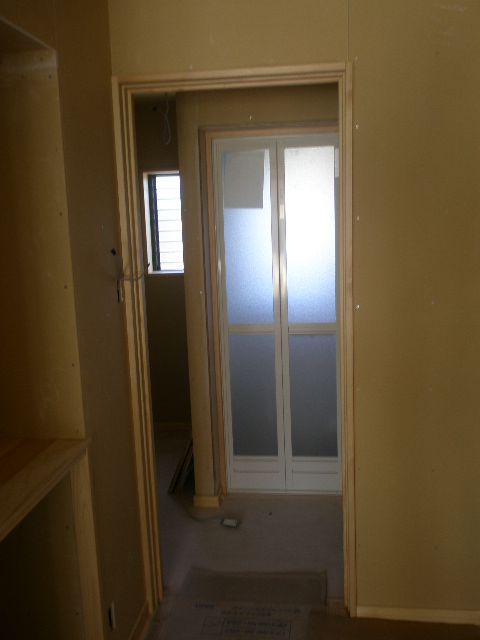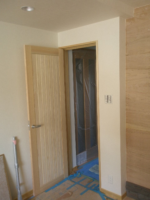 玄関を開けると桧無垢の扉がお出迎え、明かり取りとデザインを兼ねてタテスリットの建具を製作してみました。 ガラスはフロストガラスを採用しました。お値段が高いですがこのガラスにしました。 お客様はラッキーだと思いますよ。 廊下に出る扉も桧無垢材で製作しました。こちらはガラスなどは入れないタイプにしました。 母屋と共用のトイレに行き来する気配を感じさせない為です。 廊下から洗面の扉はシナベニアで製作しました。お施主様は初めベニア?て感じられていたみたいですが、 お話するうちに納得していただいたと思います。 出来上がりにも満足していただいてるご様子でした。 取っ手なども全て弊社で指示し、お施主様のお家だけのオリジナル建具が完成しました。 少し既製品に比べ高くなりますが、よい物が出来たと思います。 内装工事 2010/06/05