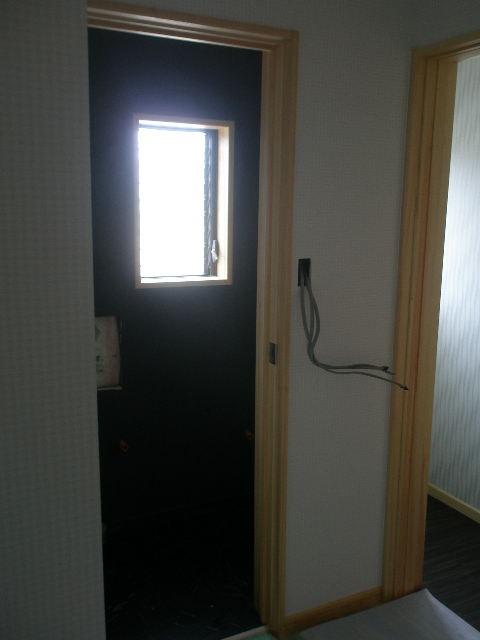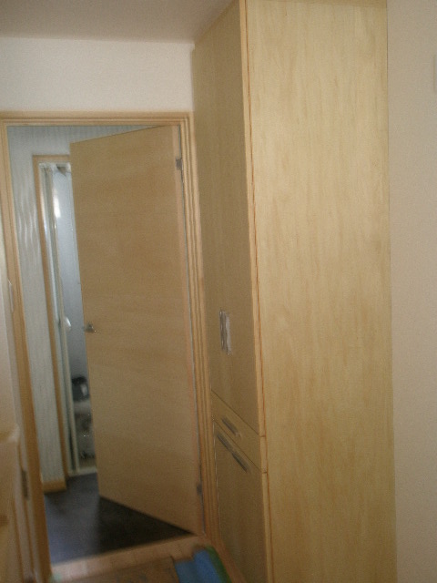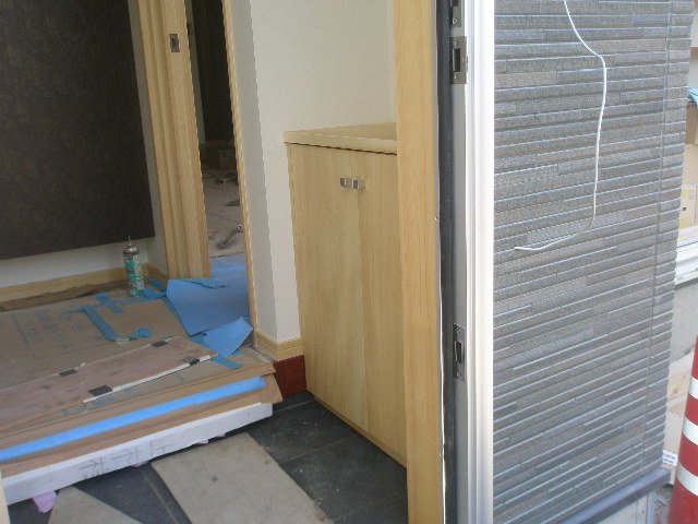この部分は階段部分の壁で当初、お施主様希望で収納スペースと依頼があったんですが、 逆の面に収納を設けリビングスペースは見せる壁にとご提案させていただき、快く承認していただきました。 真ん中の写真は玄関を入った直ぐ横のドアになります。 明かりも取り入れた無垢桧ドアです(当社オリジナル) 右側写真も当社オリジナル収納です 完成まじか!! 2010/06/08