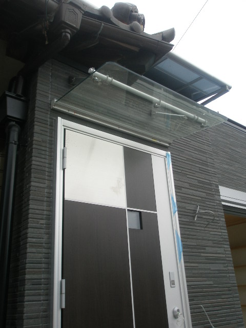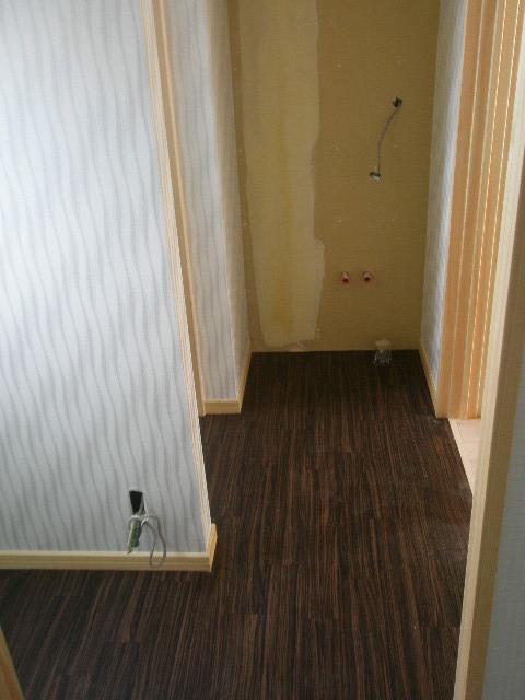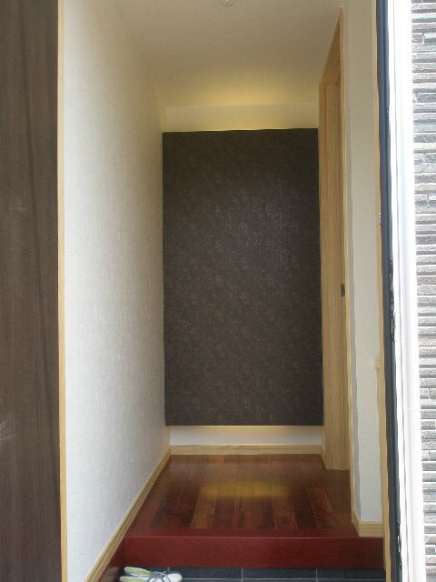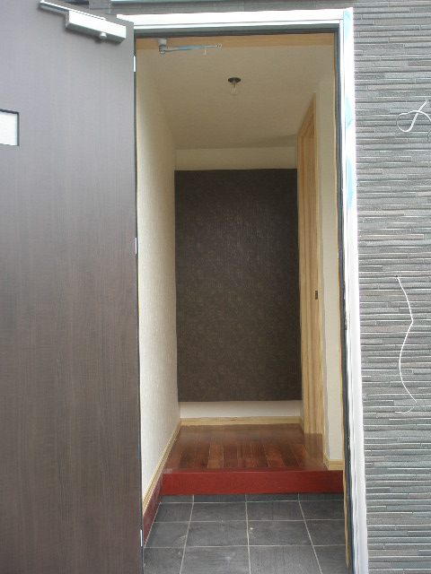 そうするとトステムのカザスドアが現れます。 ドアの上部にはアクリルルーフを取付ました。 ドアを開けると黒系のタイルとお施主様こだわりのカリン無垢フロアのお出迎えです。 正面にはアクセントとしてクロスの柄を変えてみました。 ここは思い切って革調のクロスをチョイス。 成功しました、その後ろには間接照明を設置してあります タイル工事 2010/06/05