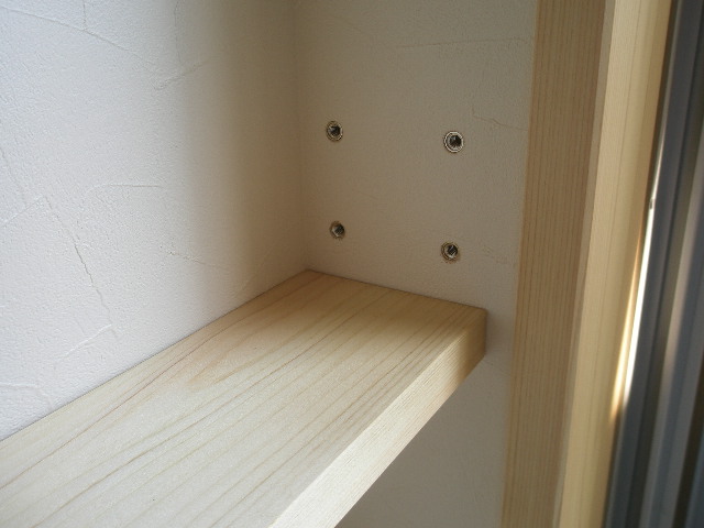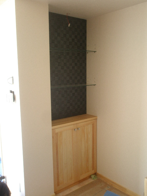 その為鉄骨の柱がどうしても出てきてしまいます。 これを逆に利用して小さな飾り棚を作りアクセントにしました。 お施主様の思い出の品などを飾っていただければと思います。 ここで一工夫です。この棚は可動棚になっているのですが、 よくあるのはアルミの棚受けが側面に取付てあり、そこに棚を置くという方法です。 それでも良いのですが、見た目が悪いので(収納スペースなら有りですが・・・) で前ちゃん考えました。壁に棚受けを直接もみ込むことにしました。 大正解です。違和感ない仕上がりです。 ちなみにLDK収納上部にも棚があるのですが、そちらも同じ方法で施工してあります。 棚自体はガラスです。 家具工事 2010/06/05