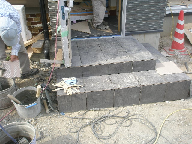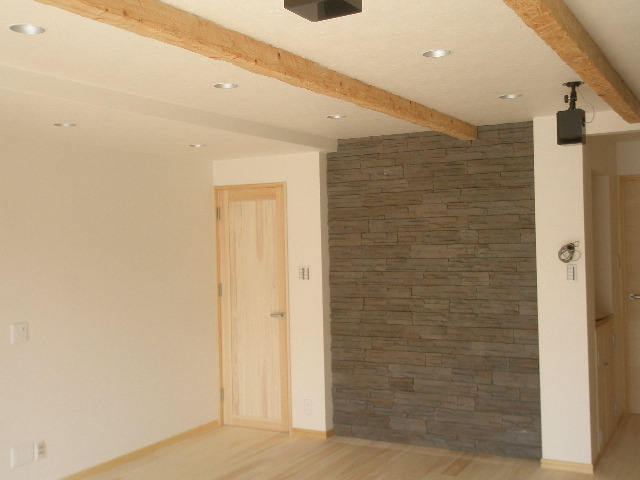 外壁と合わせて黒系のタイルを採用。 写真では解りにくいのですが、タイル自体に少し縦のラインがあり、市松模様に貼ってもらいました。 LDKの壁にも擬似石を貼り付けます。 施工中の写真ですが、完成したら豪華なLDKになると思いますよ。 内装工事 2010/06/05