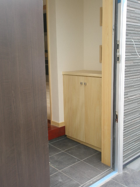 理由は限られたスーペースには既製品では対応出来ない事と全体の統一感を出す為です 下駄箱と食器棚は建具にも採用したシナベニアです。 建具と家具には自然塗料を塗布してあり、少し塗れ色感をだしました。 LDK収納は桧無垢ドアの対面にあるので、同じ桧無垢の扉にしました。 生活することも考えて扉を開けると汚れを拭き取りやすくする為ポリ合板を貼りました。 (シナベニアの自然塗料ではどうしても汚れなどが拭き取りにくい為です) 建具工事 2010/06/05